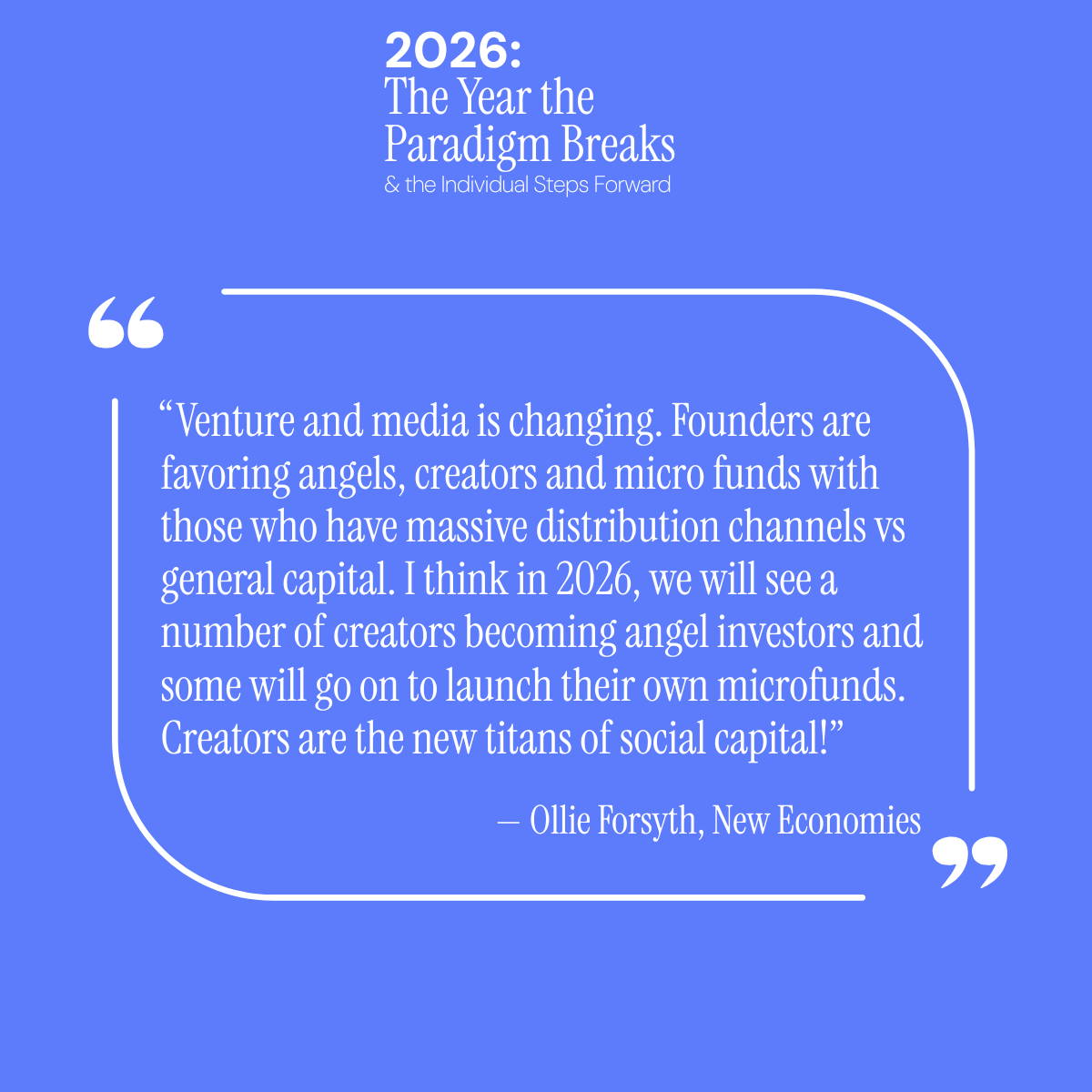 In a way, microfunds are the investment equivalent of hybrid roles: flexible, creative, fast-learning, independent. They’re shaping the next generation of companies more than most people realize. And thought leaders in the space, like Ollie Forsyth of New Economies, are taking notice, “Venture and media is changing. Founders are favoring angels, creators and micro funds with those who have massive distribution channels vs general capital. I think in 2026, we will see a number of creators becoming angel investors and some will go on to launch their own microfunds. Creators are the new titans of social capital!”